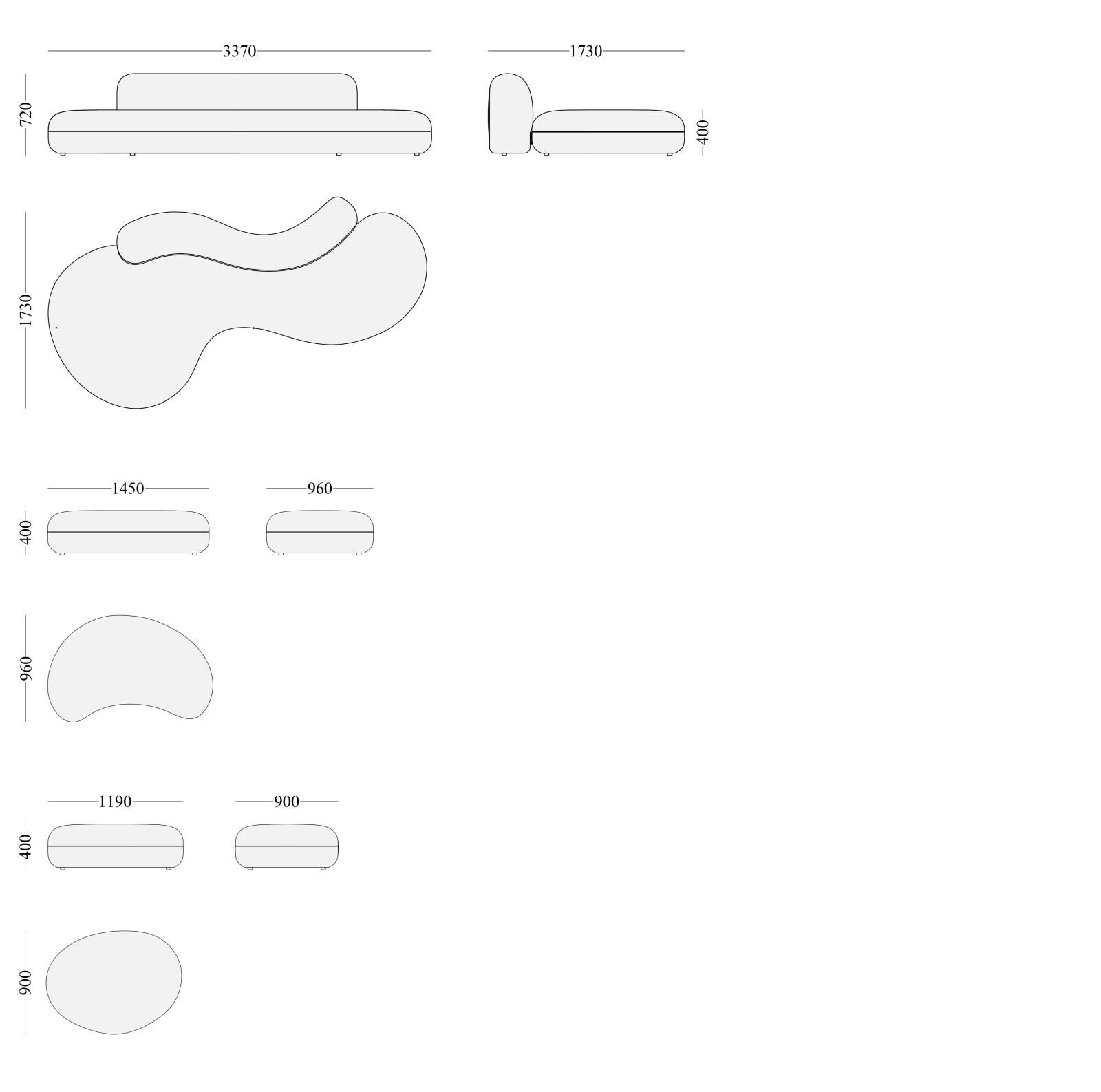 尺寸:L3370*W1730*H720mm; L1450*W960*H400mm; L1190*W900*H400mm 下载CAD