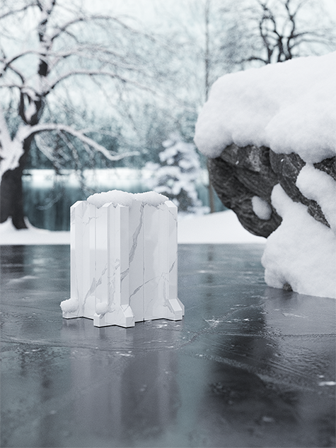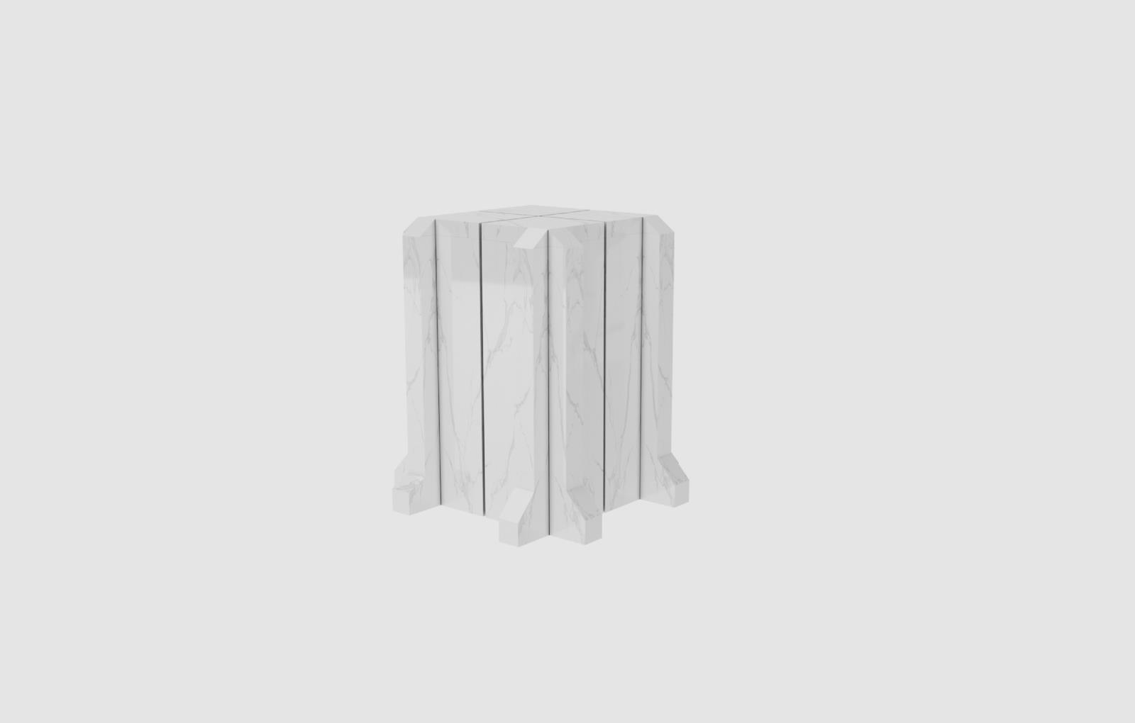 梅拉克角几整体采用意大利天然石材卡拉拉白,略带灰色纹理,其造型像极了一座博物馆或者图书馆,体现了一种西方古典建筑风格,通体构图稳实,端庄优雅。